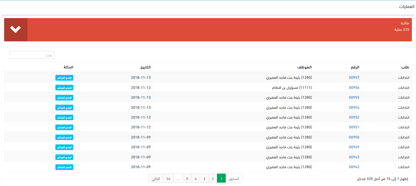 يظهر بعض المعلومات لكل عملية مثل نوع الطلب،رقم الطلب، الموظف،التاريخ والحالة.