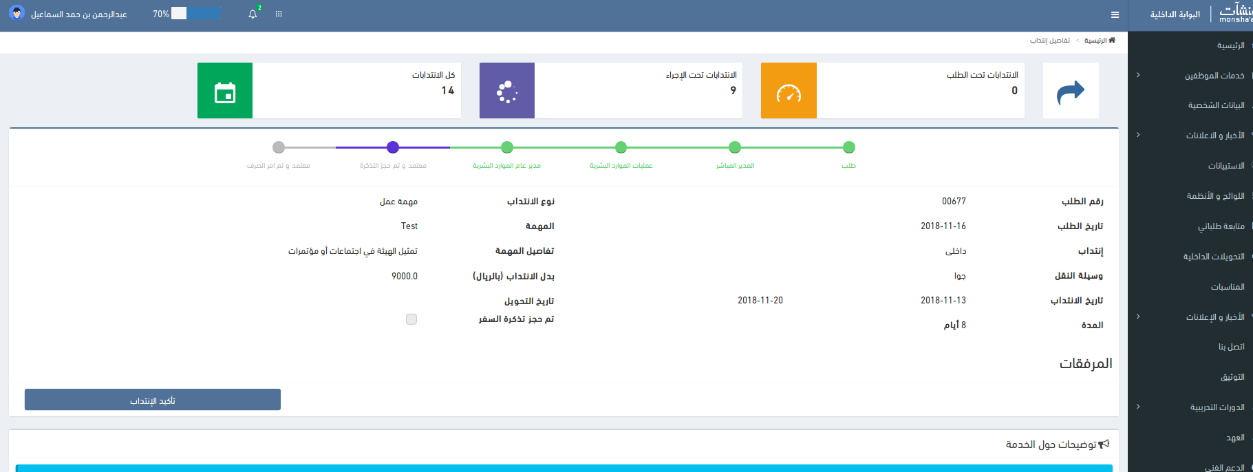 تهدف هذه الخدمة إلى تمكين الموظف من تأكيد الانتهاء من الانتداب او الدورة التدريبية, وذلك عبر الدخول على الطلب في البوابة و الضغط على زرتأكيد.