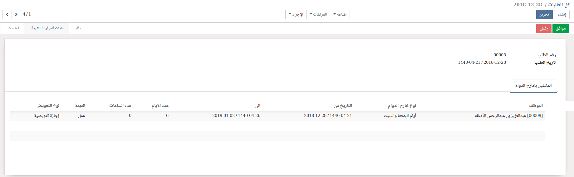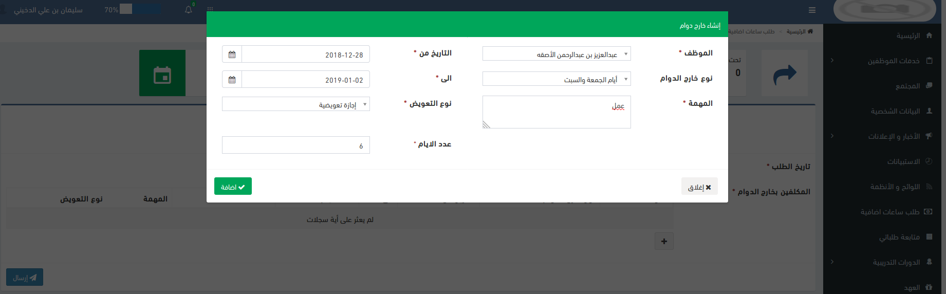 خدمة تمكن الموظف من التقديم على ساعات اضافية (خارج الدوام) حيث تحسب كبدل خارج الدوام في الراتب