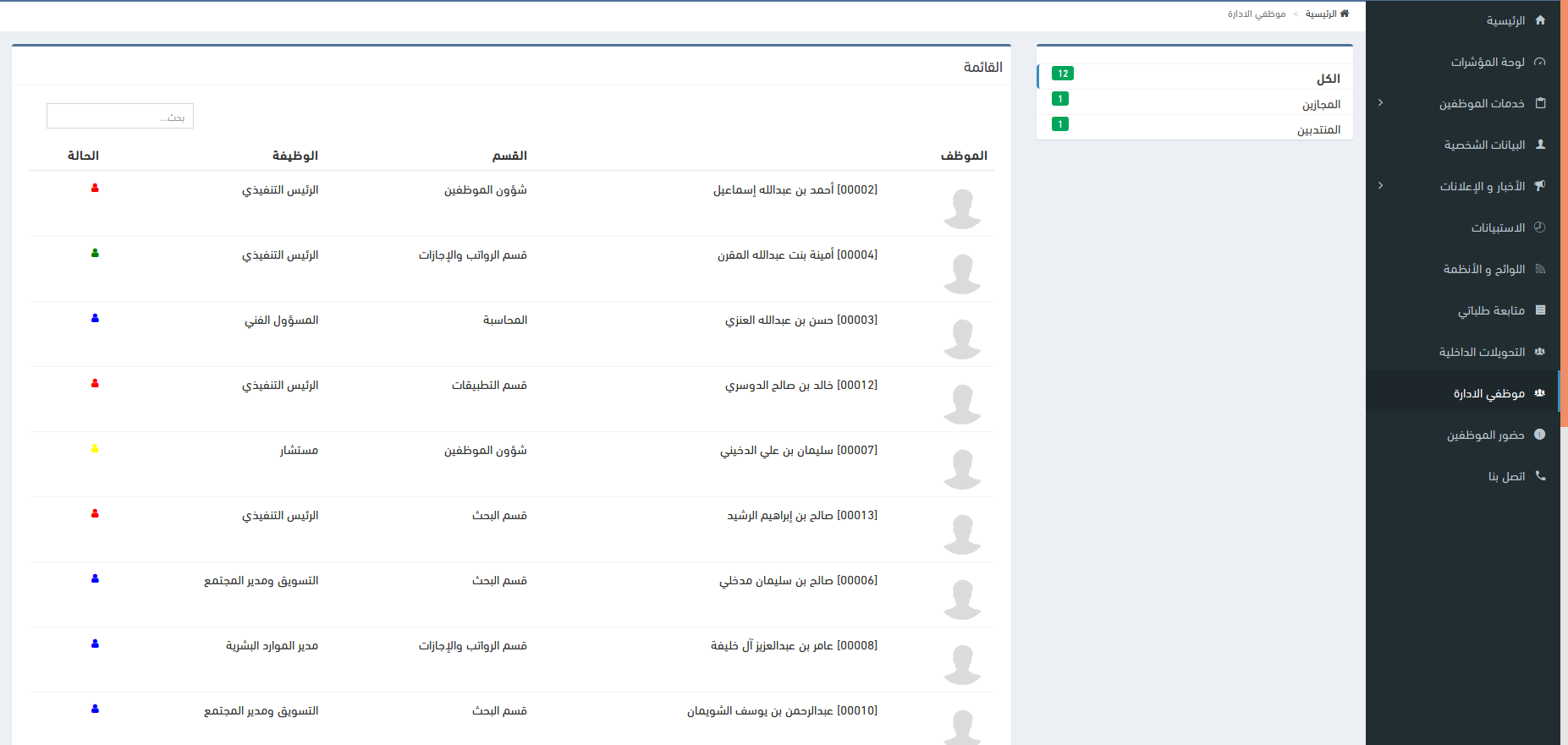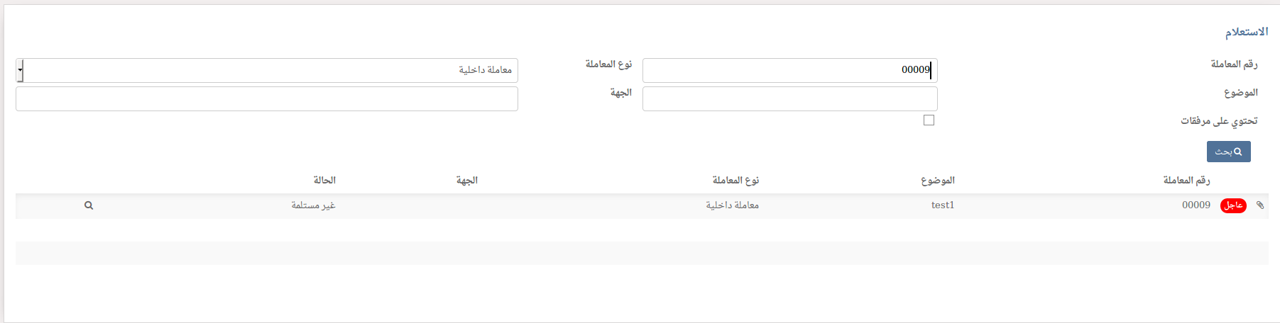يتم عرض المعاملات المستعجلة باللون الاحمر وايقونة المرفقات في حال احتواء المعاملة على مرفقات