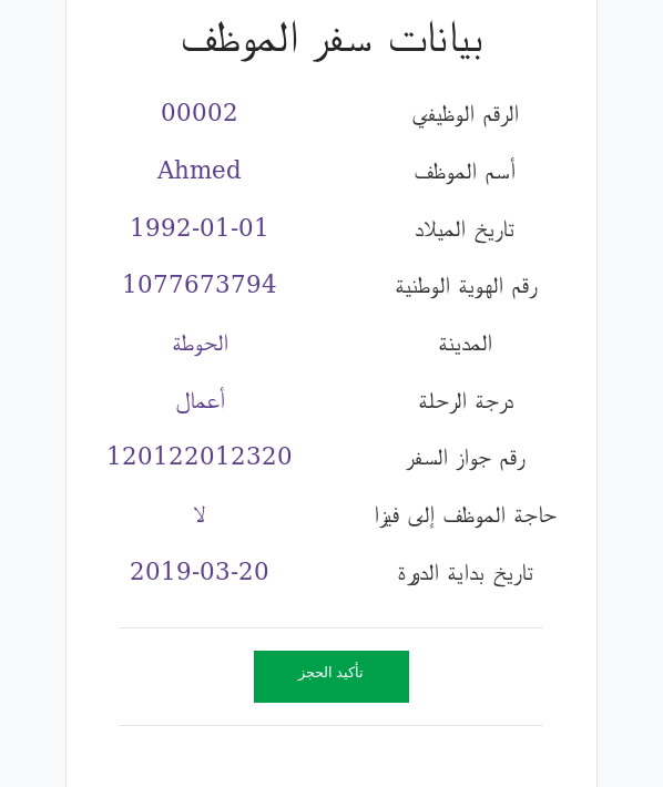 يتم ارسال بريد الكتروني لمكتب الحجز يحتوي بيانات الموظف و على زر"تأكيد الحجز"