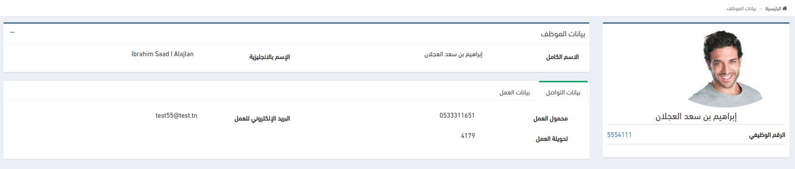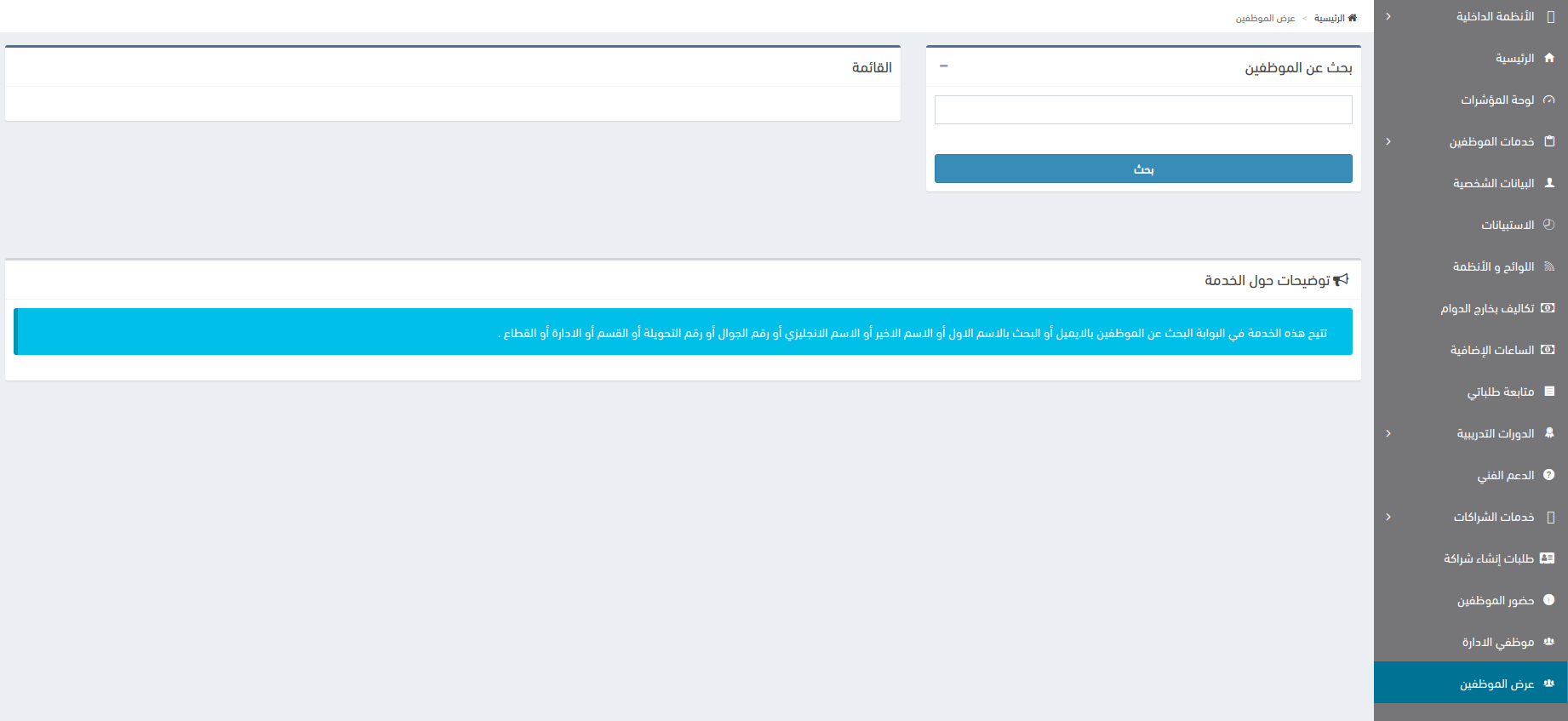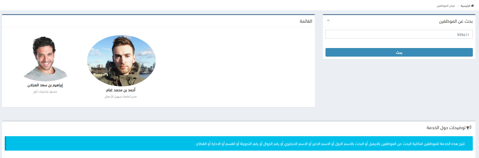 صفحة عرض للموظفين في البوابة الداخليةحيث يمكن البحث عن الموظفين بعدة حقولمثلا البحث بالايميل أو البحث بالاسم الاول أو الاسم الاخير أو الاسم الانجليزي أو رقم الجوال أو رقم التحويلةأو القسم أو الادارة أو القطاعأو المسمى الوظيفيويتم استعراض الموظفين كبطاقات و عند الضغط عليها تظهر المعلومات المتفق عليها وليس كل المعلومات