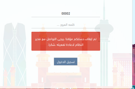 عندما يخطأ الموظف في تسجيل دخوله 3 مرات يتم حظر حسابه و اظهار الرسالة التالية في شاشة الدخول: