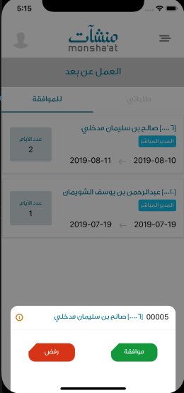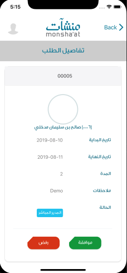 بالنسبة للطلبات في قائمة "للموافقة" تضاف لتفاصيل الطلب إسم و صورة الموظف الذي قدم الطلب و إمكانية موافقة أو رفض الطلب.