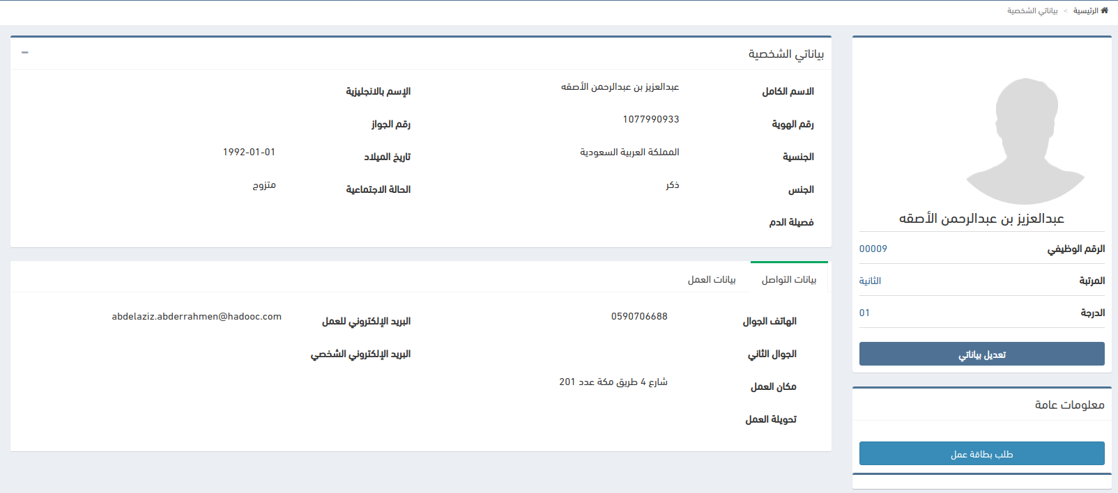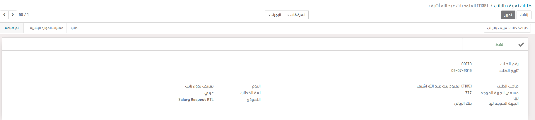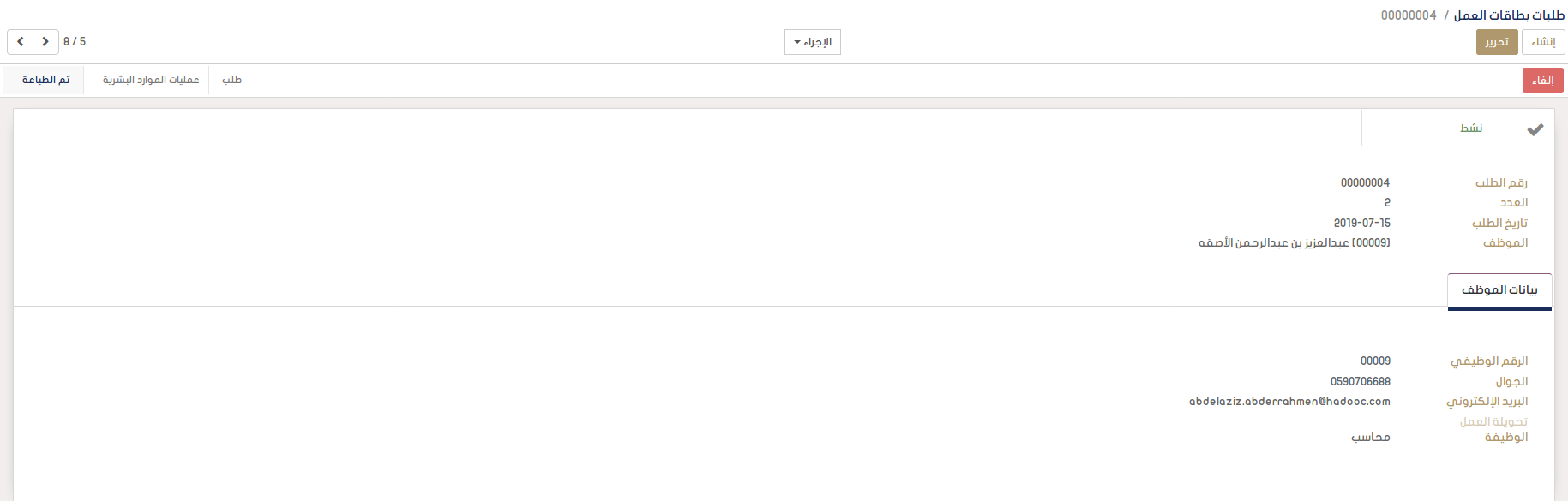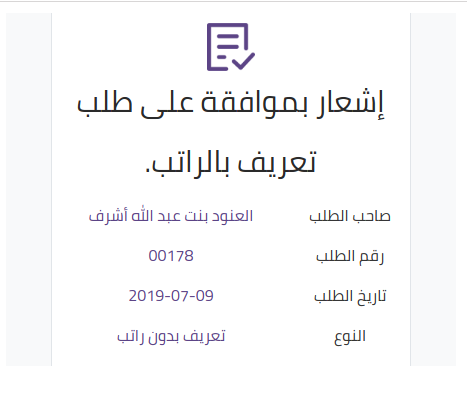 يظهر الطلب عند الموارد البشرية باسم الموظف و بياناته و يقوم المسؤول بالموارد البشرية بفتح الطلب و التعديل عليه باضافة "العدد" الذي سيتم طباعته . ثم يقوم باعتماده.