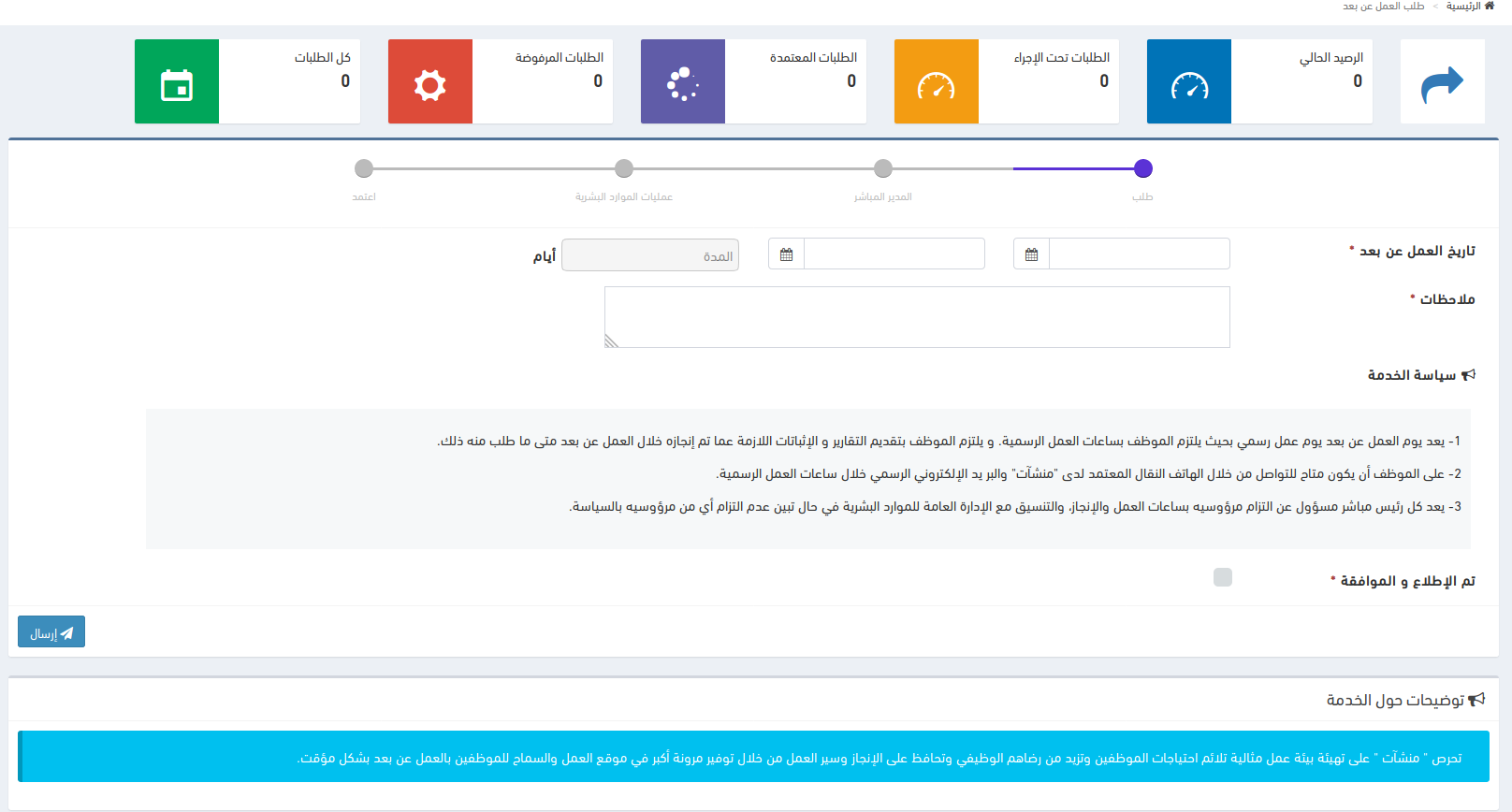 اضافة سياسة الخدمة و حقل تم الإطلاع و الموافقة في شاشة العمل عن بعد في البوابة.