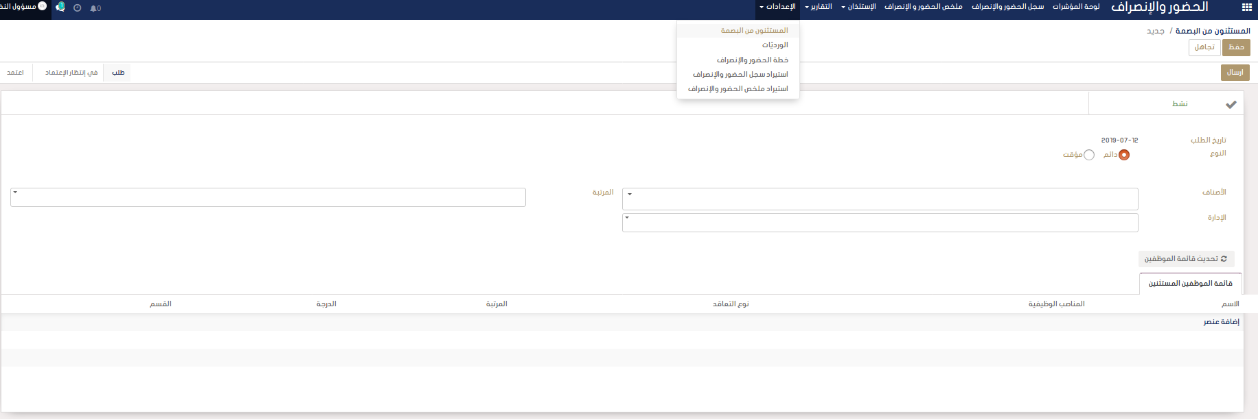 اضافة خدمة الموظفين المستثنين من البصمة في نظام الحضور و الانصراف.