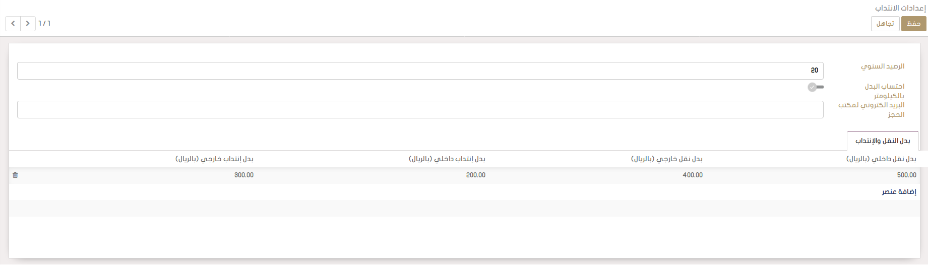يمكن الموارد البشرية من إدخال البريد الإلكتروني لمكتب الحجز من خلال اعدادات الإنتداب و التدريب ليتم الارسال اليه عند استخدام خاصية " ارسال لمكتب الحجز" في الانتدابات و التدريب.