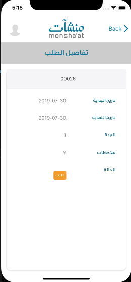 تعرض هذه الصفحة جميع تفاصيل الطلب ( تاريخي بداية و نهاية الطلب , مدتها و الوضع الحالي للطلب ).