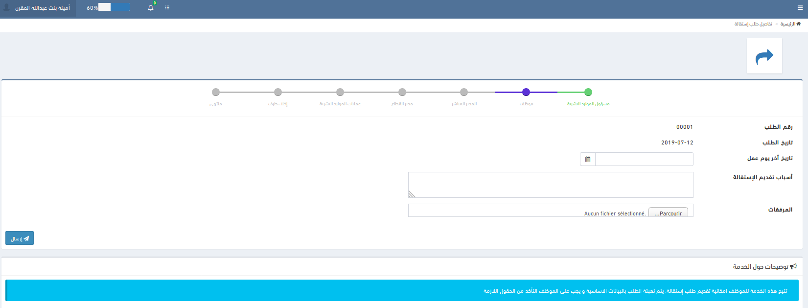 عند فتح الاشعار يقوم الموظف بتعبئة البيانات (تاريخ أخر يوم عمل، أسباب تقديم الإستقالة ، المرفقات) و ارسال الطلب للمدير المباشر في البوابة.