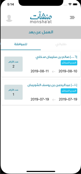 تتيح هذه الخدمة للموظف الاطلاع على طلبات العمل عن بعد المقدمة سابقا, تاريخها وحالتها. بالنسبة للطلبات في قائمة "للموافقة" يضاف إسم الموظف و إمكانية موافقة أو رفض الطلب.