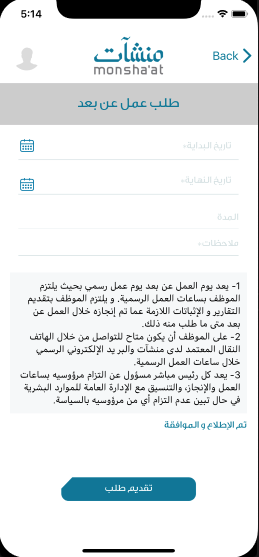 تتيح هذه الخدمة للموظف إمكانية تقديم طلب عمل عن بعد عبر التطبيق