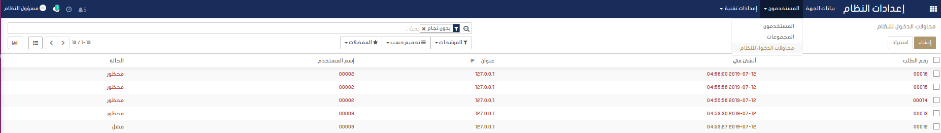 عند حضر الدخول يتم إشعار و إرسال أميل لمدير النظام. يستطيع مدير النظام إلغاء حظر الدخول من خلال قائمة محاولات الدخول .