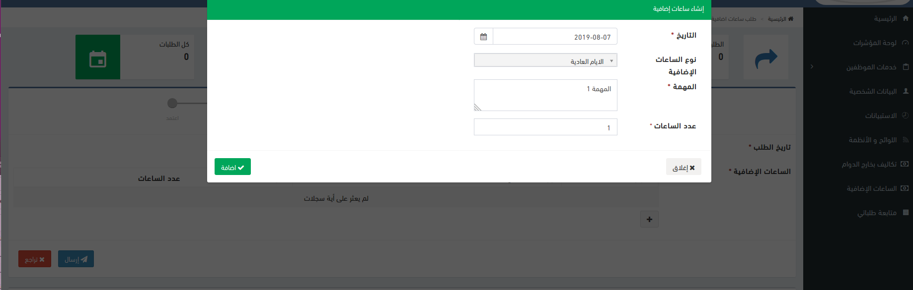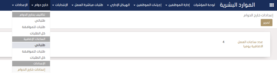 اضافة إعدادات خارج الدوام للتحكم بالحد الاقصى لساعات العمل الاضافية من طرف موظف خارج الدوام.