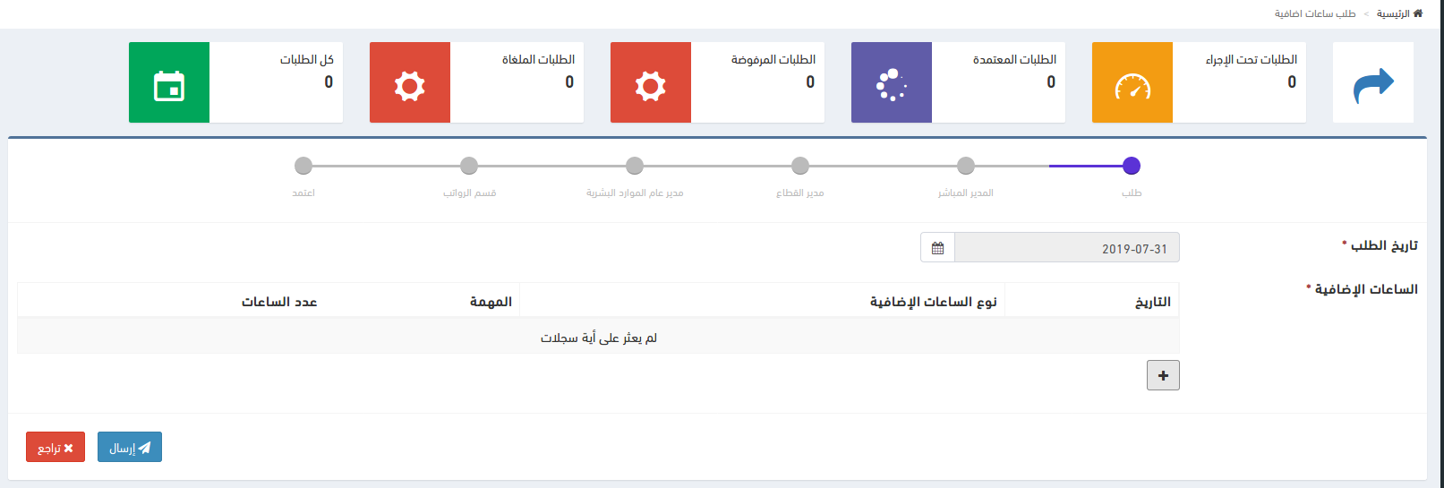 يقوم الموظف بإنشاء طلب ساعات عمل اضافية من البوابة ثم يقوم بإرساله للمدير المباشر للموافقة عليه من البوابة أو الإيميل.