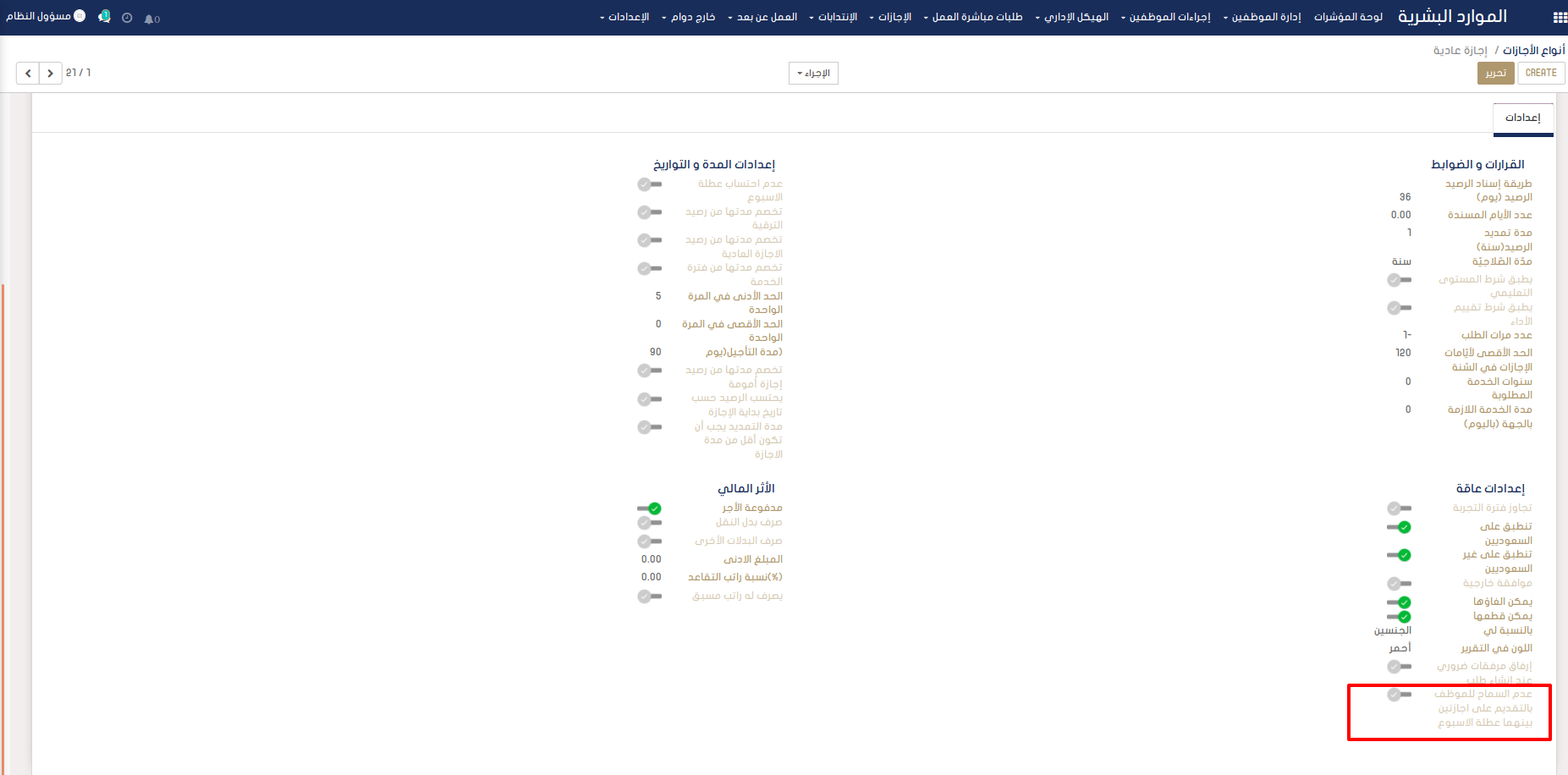 عند طلب إجازة يوم الأحد يقوم النظام بالتثبت من وجود إجازة أخرى تنتهي يوم الخميس الذي يسبقه. وفي حال وجودها لا يسمح النظام بتقديمها.