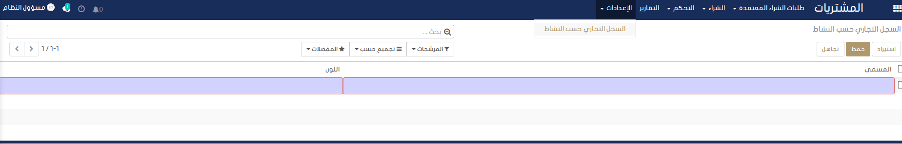 يتم إنشاء ألسجلات التجارية حسب النشاط من خلال منيو السجل التجاري حسب النشاط الموجود تحت منيو الإعدادات.