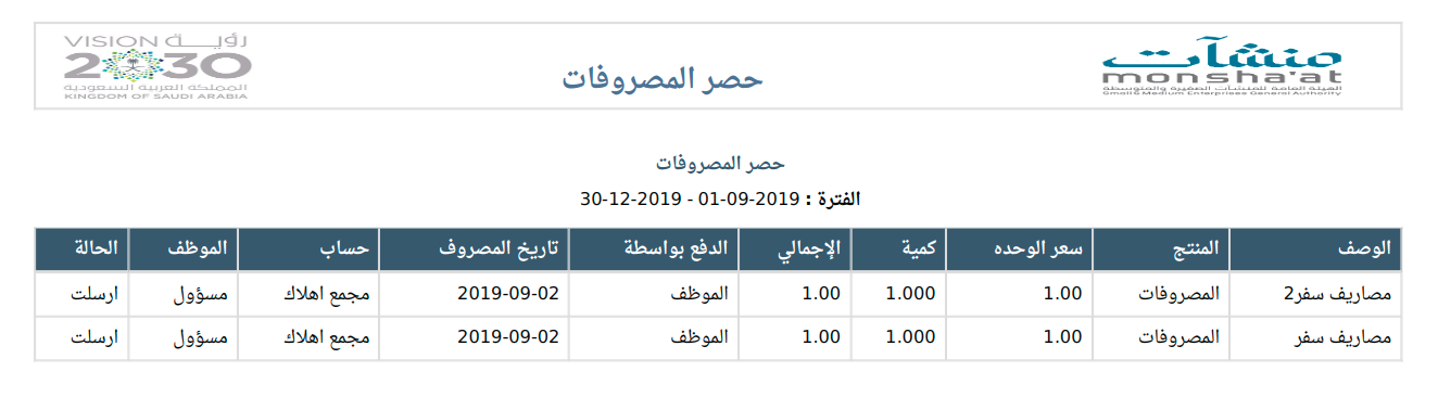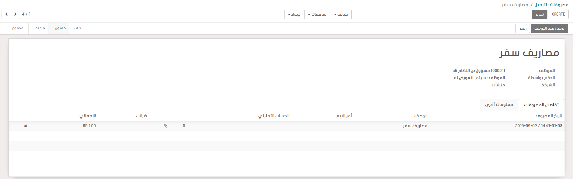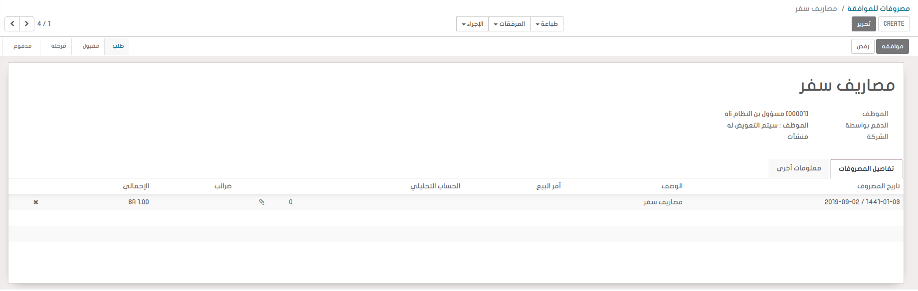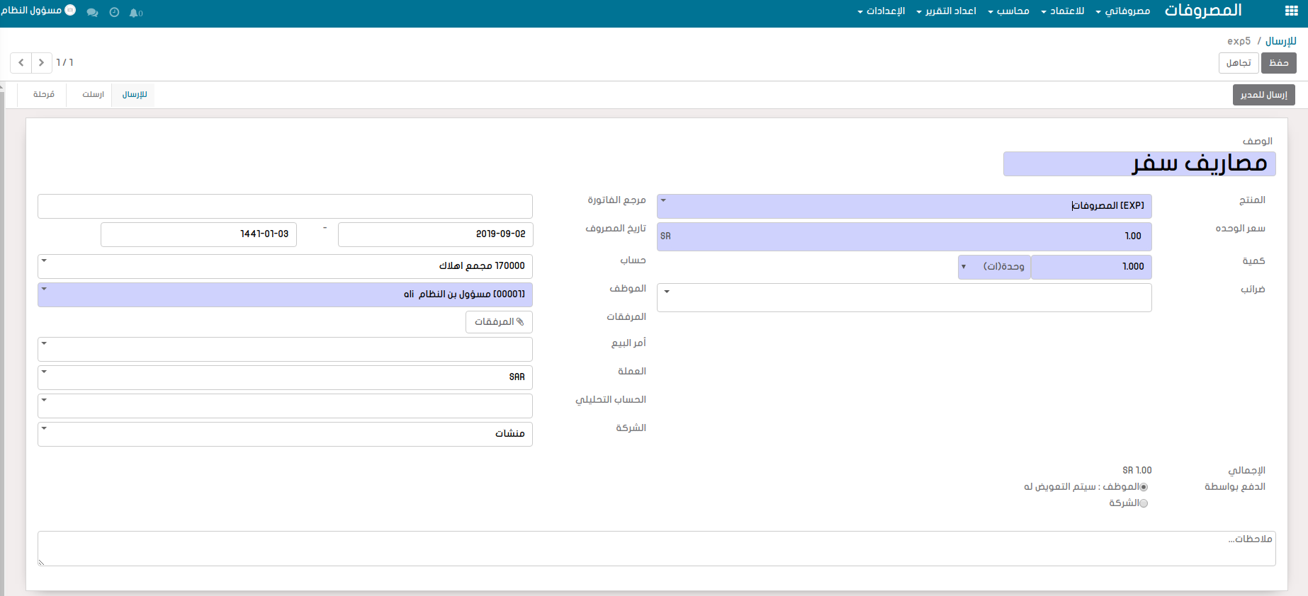 توتيح خدمة "المصروفات" من إنشاء طلب مصروفاتي واختيا ر للأرسال ثم انشاء وتحديد وصف للمصروف واختيار منتج المصروفات من القائمة وتحديد تاريخ المصروفات وسعر الوحدة والكمية ان وجدت او السعر الاجمالي والكمية