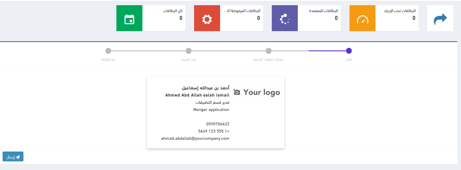 يتم عرض نموذج لبطاقة العمل لالموظف ليتم إرساله لإدارة الموارد البشرية للموافقة عليه ومن ثم طباعته.