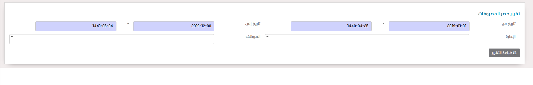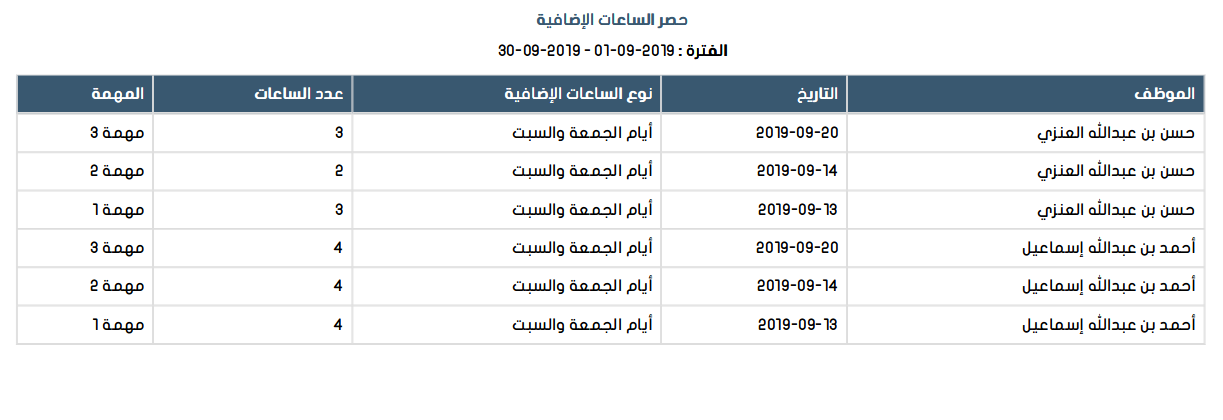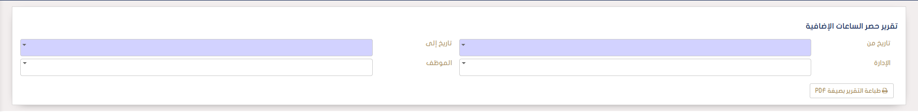 إضافة تقرير حصر الساعات الإضافية تحت منيو خارج الدوام. يستطيع الموظف تبعت تقرير من خلال إختيار الفترة و الإدارة و الموظف. تكون شاشة الحصر كالأتي :