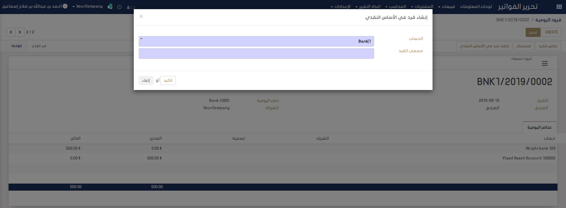عند إستخدام بعض هذه الحسابات في قيود أساس الإستحقاق يظهر زر "إنشاء قيد في الأساس النقدي" عند الضغط عليه تظهر شاشة يحدد فيها الحساب الخاص بالأساس النقدي ويتم إنشاء قيد في الأساس النقدي.