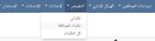 يمكن الإطلاع على طلبات التفويض من خلال المنيو الرئيسي التفويض. يحتوي المنيو الرئيسي التفويض على المنيو الفرعي طلباتي، طلبات للموافقة و كل الطلبات