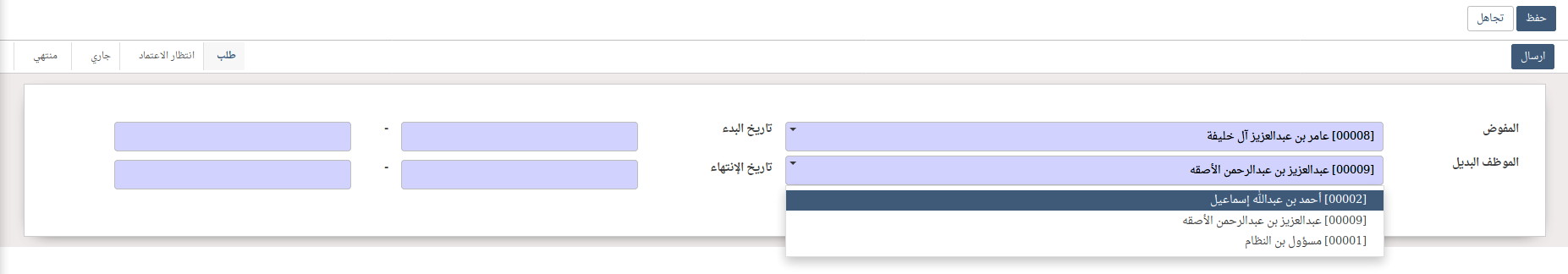 يمكن للمدير المباشر تقديم طلب تفويض و إرساله إلى مسؤول التفويض الذي يقوم بقبوله أو رفضه.