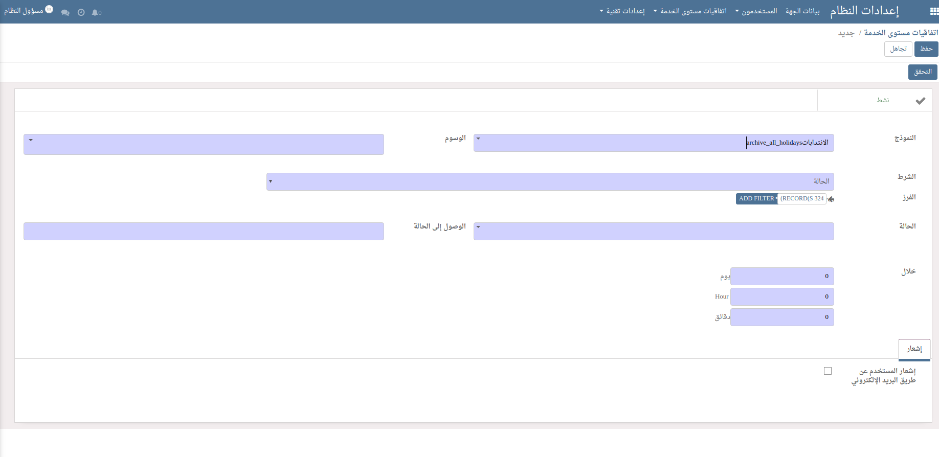يمكن لمسؤول النظام تحديد مقاييس مستوى الخدمة لكل إجراء ثم يتم إضافة وسوم تلقائيا للسجلات المعنية مثل (متأخرة ، عاجلة ..).