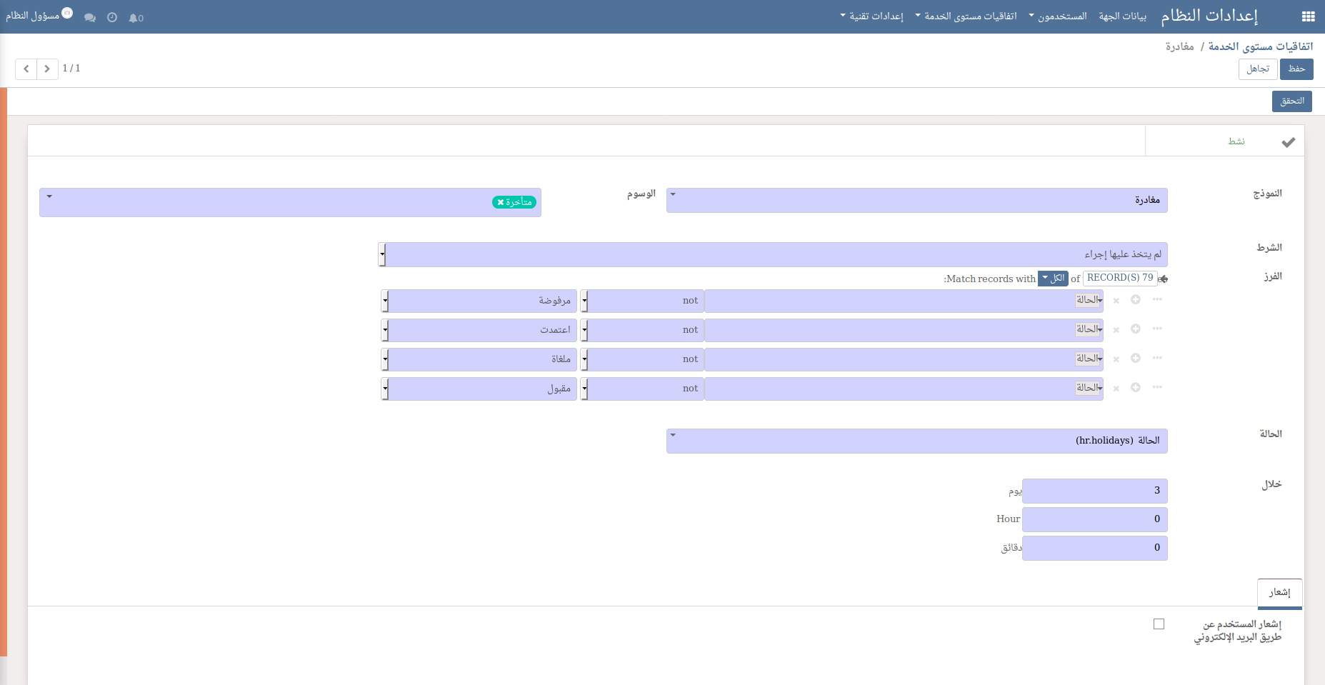 كيف يتم تحديد إجازة على أنها متأخرة إذا لم يتم عليها أي إجراء منذ 3 أيام: