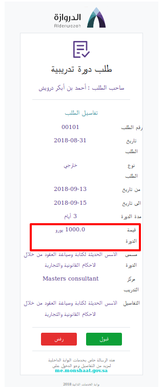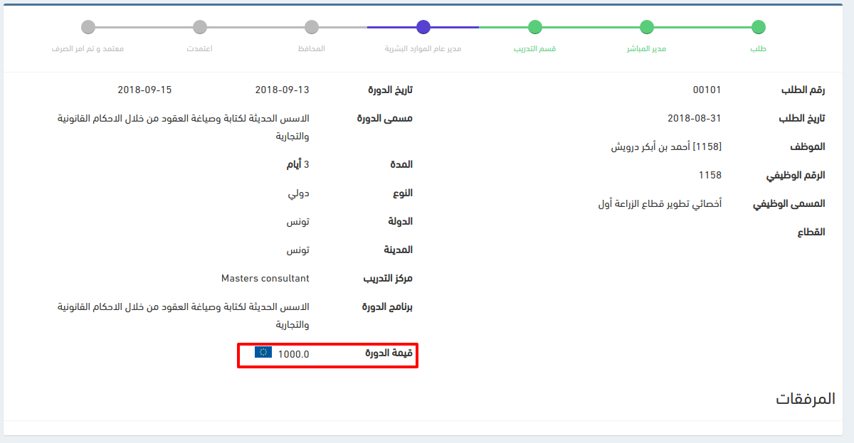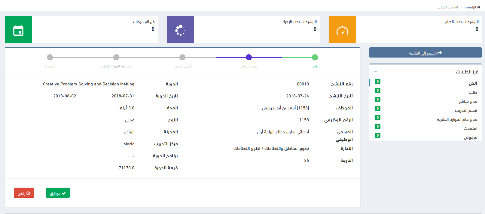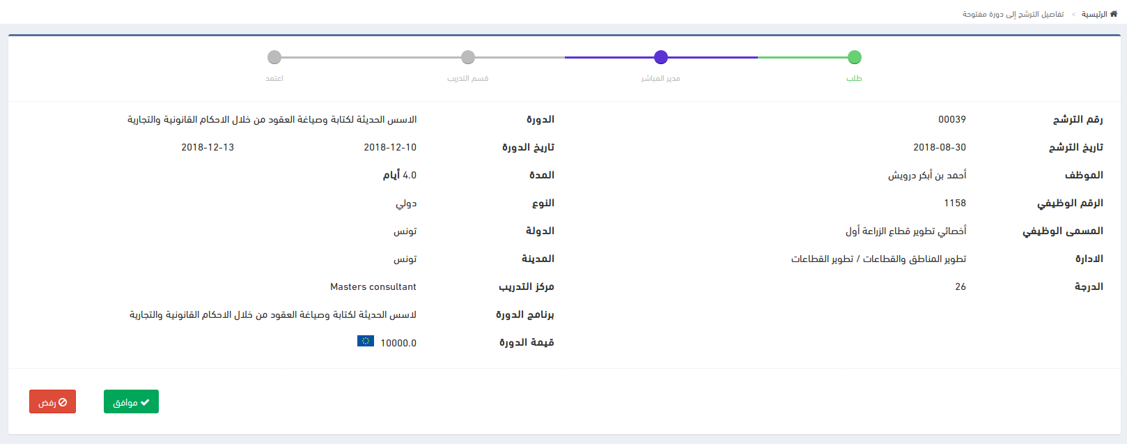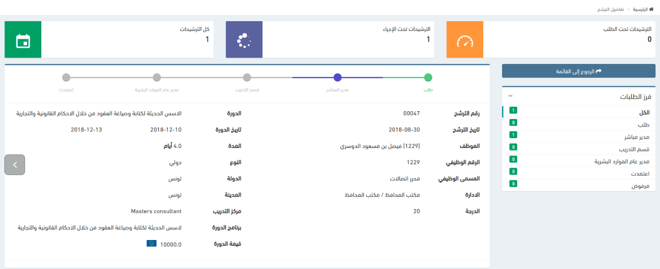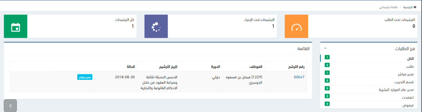 إظهار طلب الترشيح لدورة مفتوحة للمدير المباشر لقبوله أو رفضه في الصفحة الرئيسية