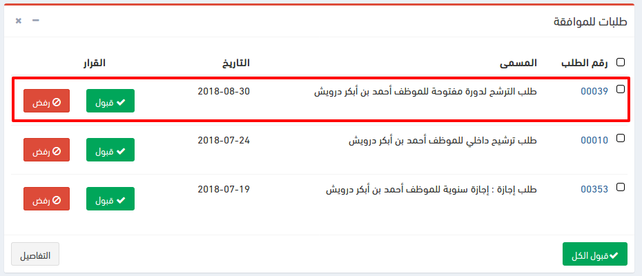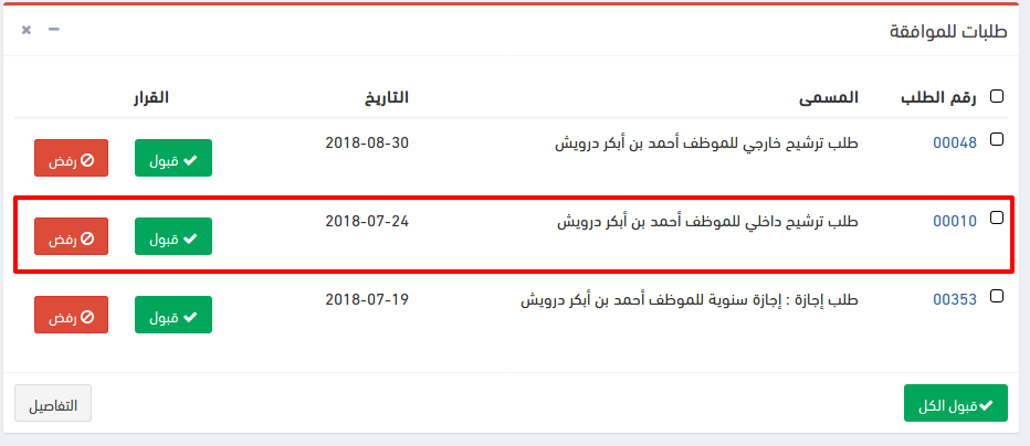 إظهار تفاصيل ترشيحاتي للمدير المباشر لقبوله أو رفضه